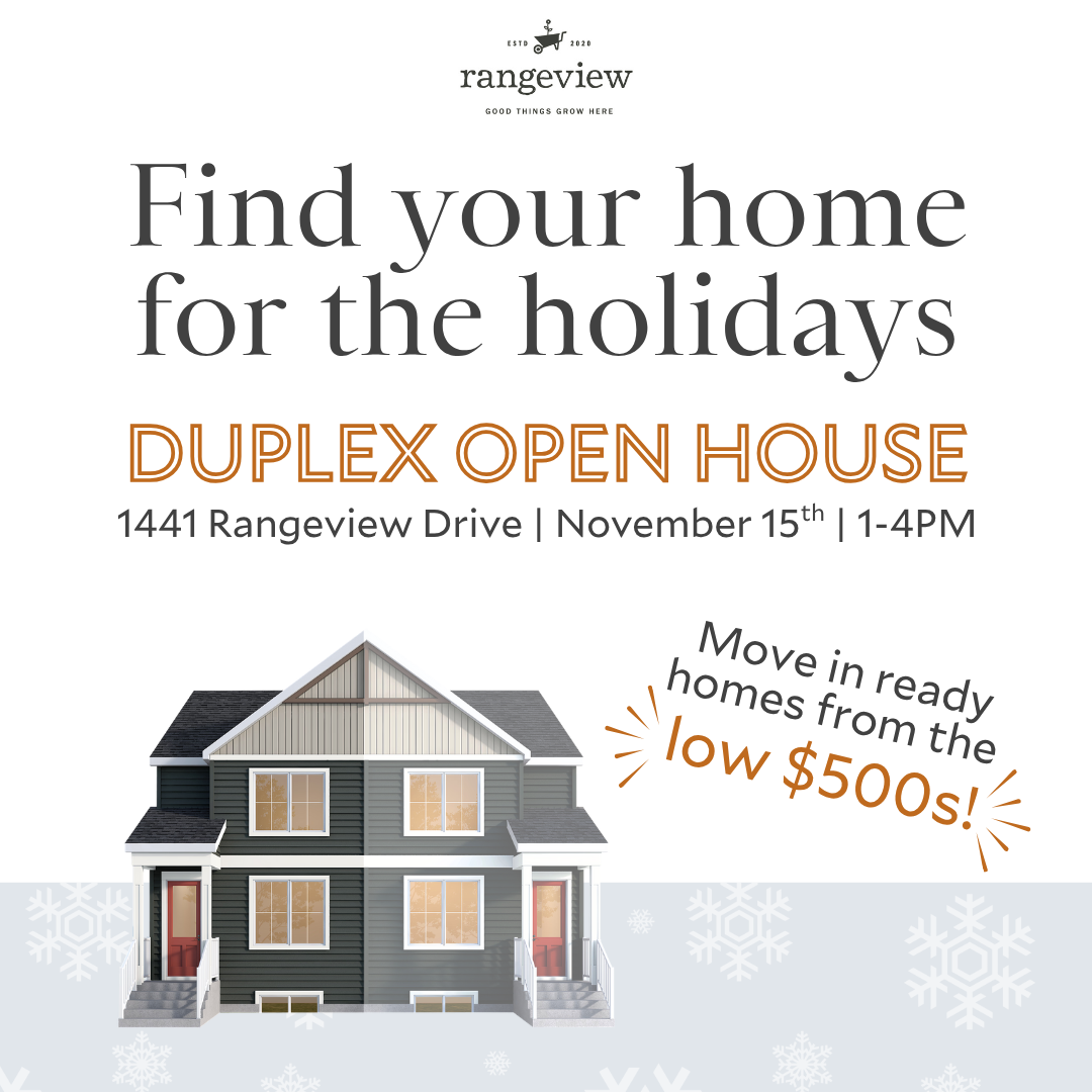 Don’t wait! Our most popular duplex models are ready now, and exclusive year-end savings make this the perfect time to buy! Join us on November 15th and give yourself the ultimate gift this holiday season: your dream home in Rangeview.
