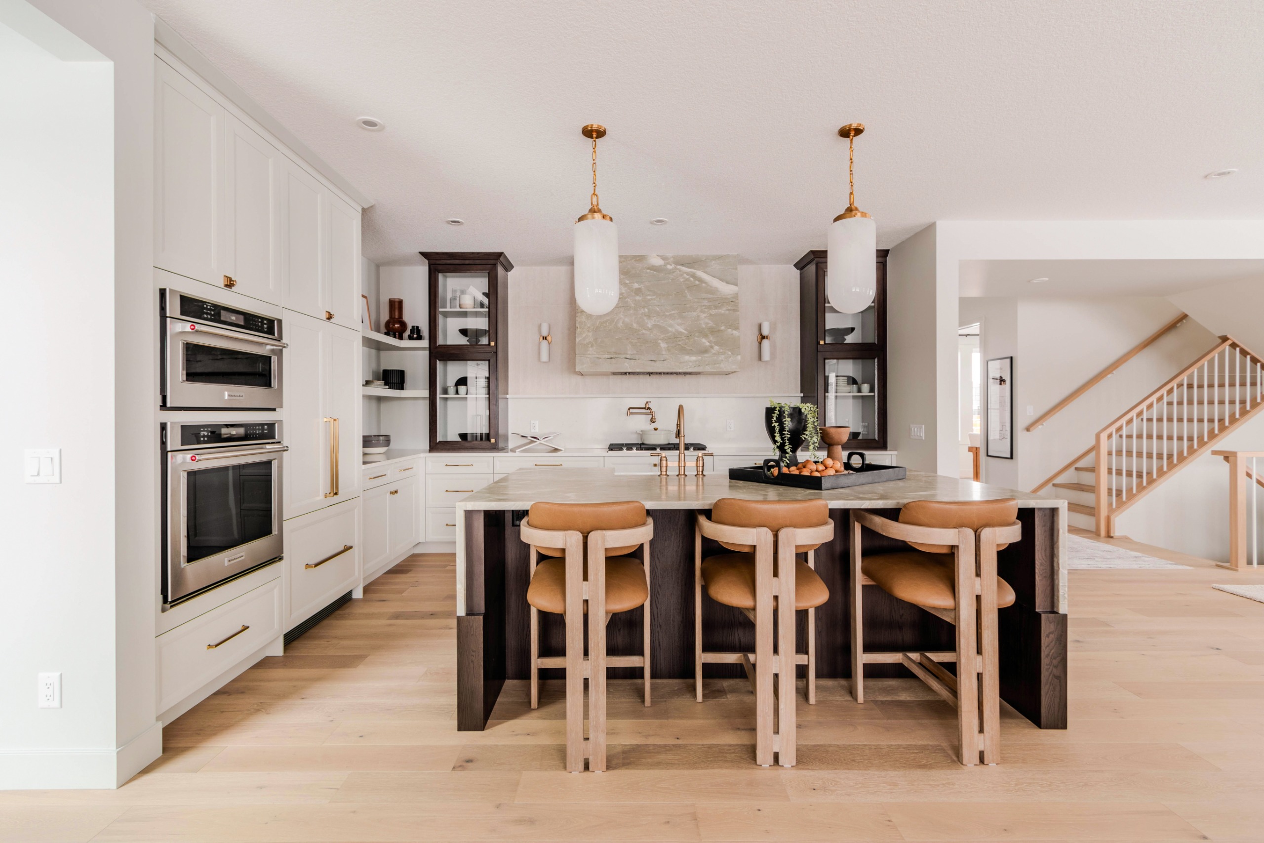 The great room and kitchen are positioned so people can maintain eye contact and continue conversations with others in one room despite entering the other. For instance, one can stand behind the kitchen island and directly face someone else sitting on the couch along the great room’s rear wall. This island dazzles with a waterfall-style design and incorporates an eating bar that seats at least three people.The grand L-shaped kitchen stands out with an abundance of cabinets and high-end features, including an integrated fridge with french doors. Behind its side wall is a butler’s pantry that extends into a conventional pantry.