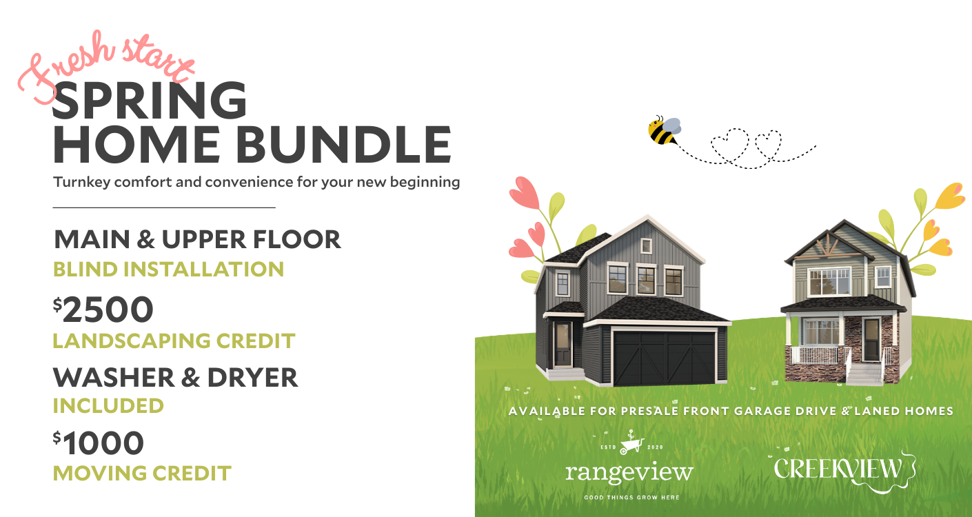 This limited‑time Spring Home Bundle is available on Laned and Front Garage presales in Rangeview and CreekView. Get in touch with our team to learn more, secure your home, and start fresh this spring!